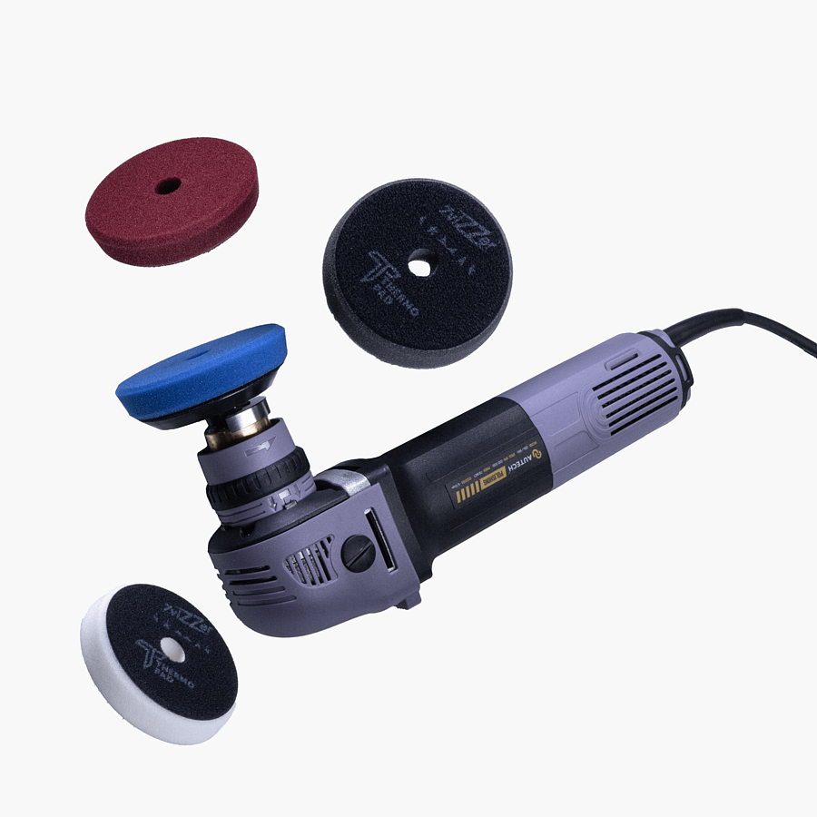 - Система 3-в-1: быстрая смена типа привода от деликатного эксцентрика (орбита 8 или 12 мм) до ротора для агрессивного локального выпиливания дефектов лака.