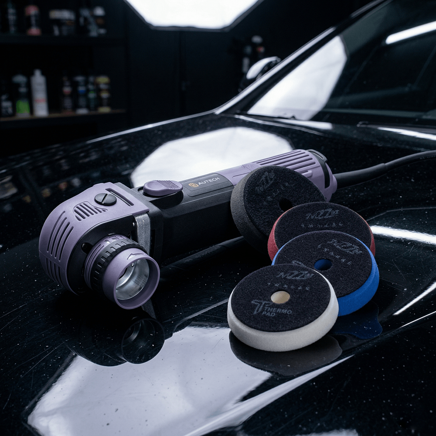 Эта компактная машинка — настоящий мультитул для профессиональных полировщиков. Благодаря сменным эксцентриковым блокам на 8 и 12 мм, а также роторной насадке, она идеально закрывает потребность в проработке сложных рельефов, стоек, бамперов, зон под дверными ручками и интерьерного глянца. Честная мощность в 710 Вт гарантирует уверенную резку сложных дефектов и глубоких царапин, а также безупречный финиш без голограмм на локальных участках.